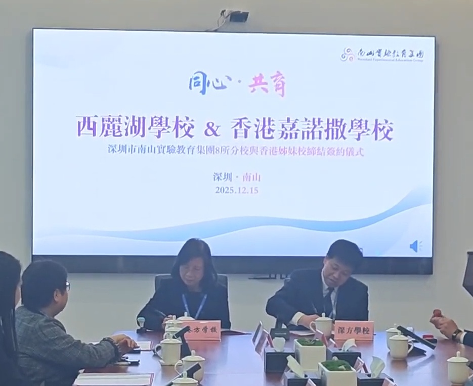 為促進粵港澳大灣區教育交流與合作,增進兩地學子相互學習,本校與深圳市南山實驗教育集團西麗湖學校於2025年12月15日(星期一)上午,在深圳市麒麟中學舉行了隆重的締結姊妹學校簽約儀式。儀式上,兩校校長代表各自學校,在友好熱烈的氣氛中簽署了姊妹學校合作協議,標誌著兩校正式建立緊密的教育夥伴關係。此次締約不僅是兩校情誼的開端,更是日後深度交流的重要基石。