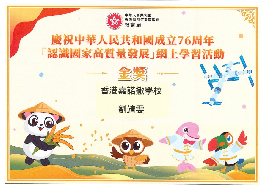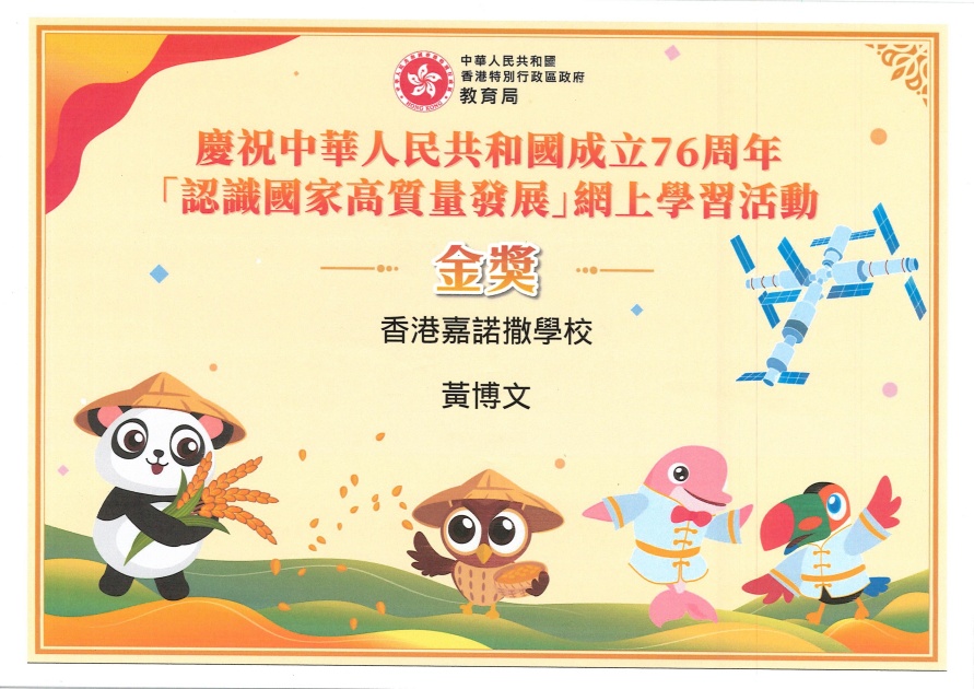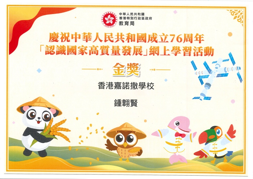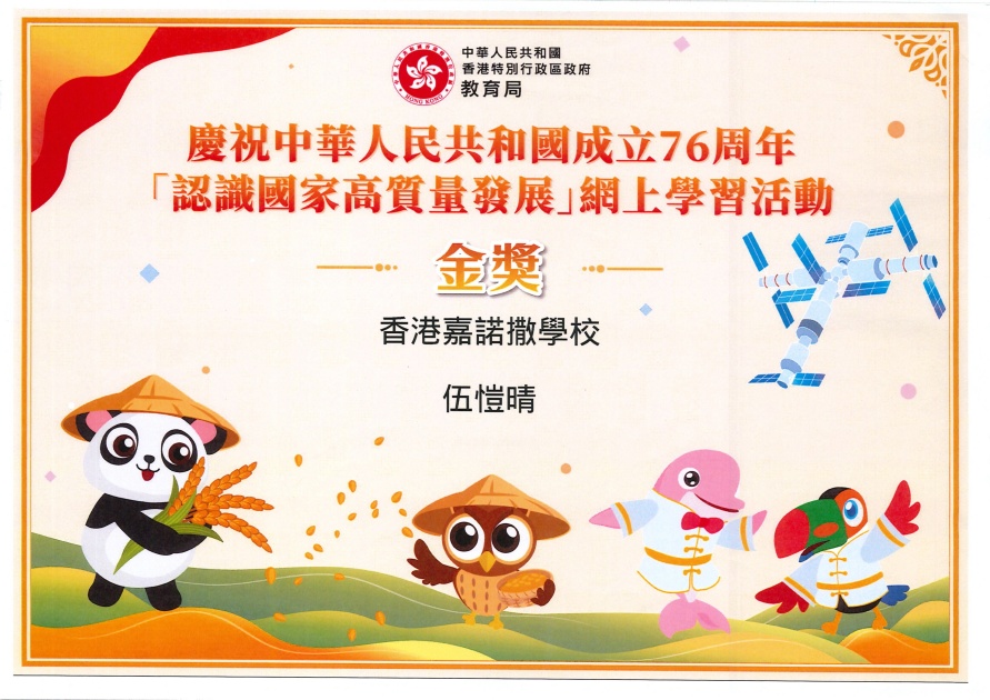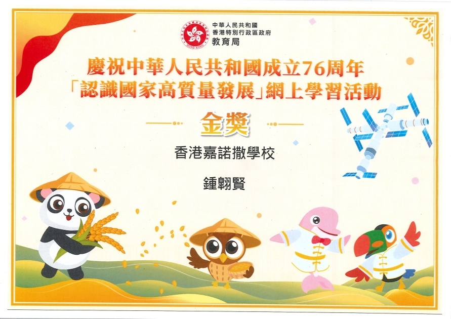 為慶祝中華人民共和國成立76周年,本校學生積極參與由教育局主辦、香港教育城協辦的「認識國家高質量發展」網上學習活動。活動以網上闖關形式進行,設三關影片及問答,涵蓋航天科技、人工智能、碳中和、非物質文化遺產及「一帶一路」基建等國家新時代發展成就。學生須答對半數題目方可過關,極考驗專注與理解力。