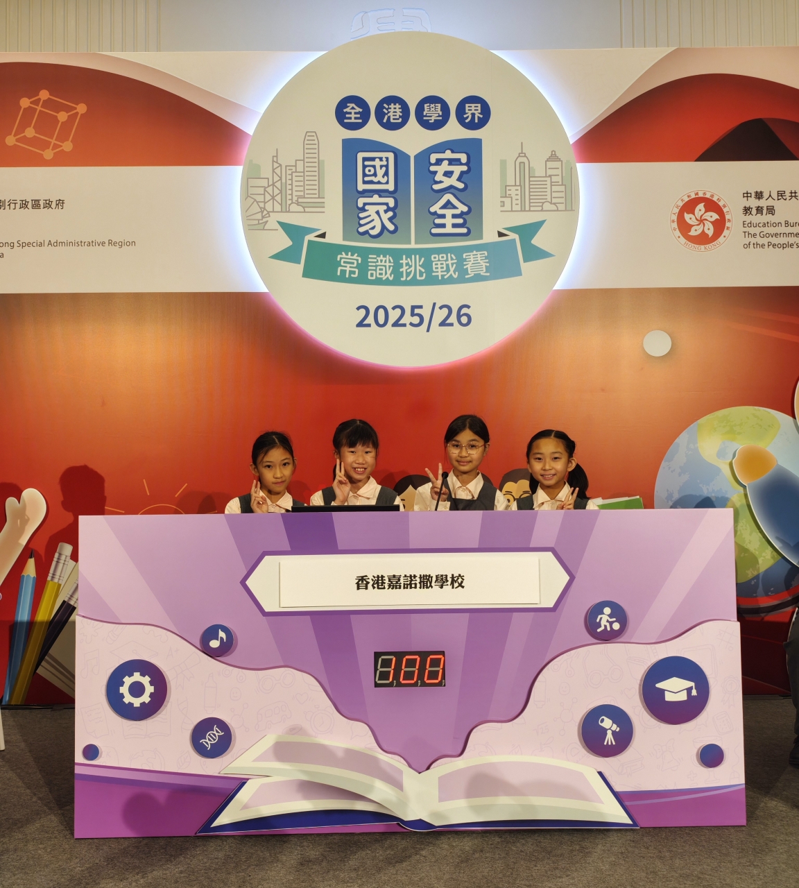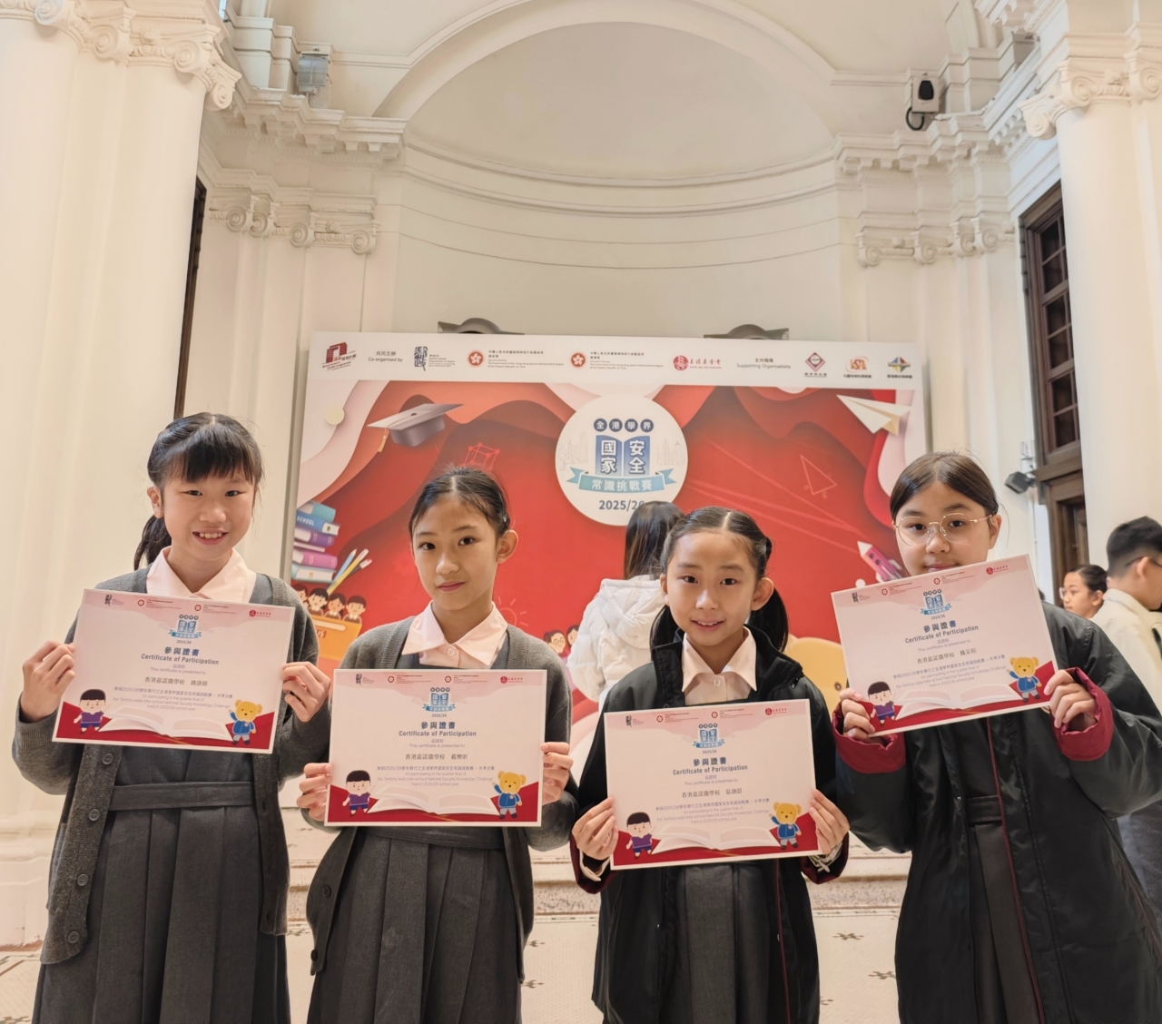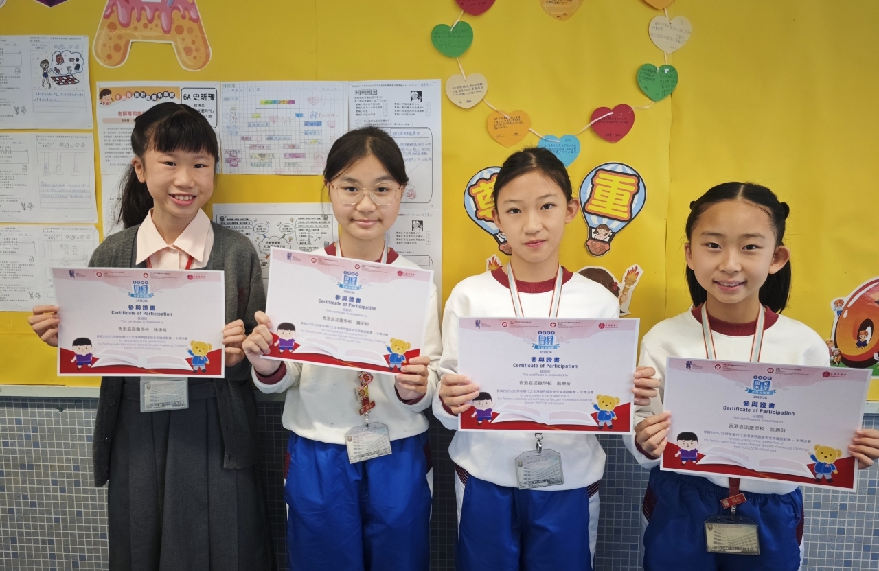 為提升學生對國家安全的認識,培養國民身份認同,本校學生早前積極參與「全港學界國家安全常識挑戰賽」。同學在首階段的網上問答初賽中表現出色,成績優異,因而成功取得晉級資格。隨後,本校派出四位從初賽中脫穎而出的六年級學生,於2025年11月19日(星期三)前往中環炮台里1號前法國外方傳道會大樓一樓,參加現場舉行的準決賽。賽事設有緊張刺激的搶答環節,我校代表全情投入,他們反應敏捷、積極作答。即使面對不確定答案的題目,他們亦毫不怯場,勇於嘗試,盡力爭取每一分,充分展現了求學求真、迎難而上的可貴精神。同學們從網上初賽到現場準決賽的優秀表現,是個人努力與學校重視國民教育共同成果的體現。期待他們在未來的學習中繼續保持這份積極進取的態度,力爭佳績!