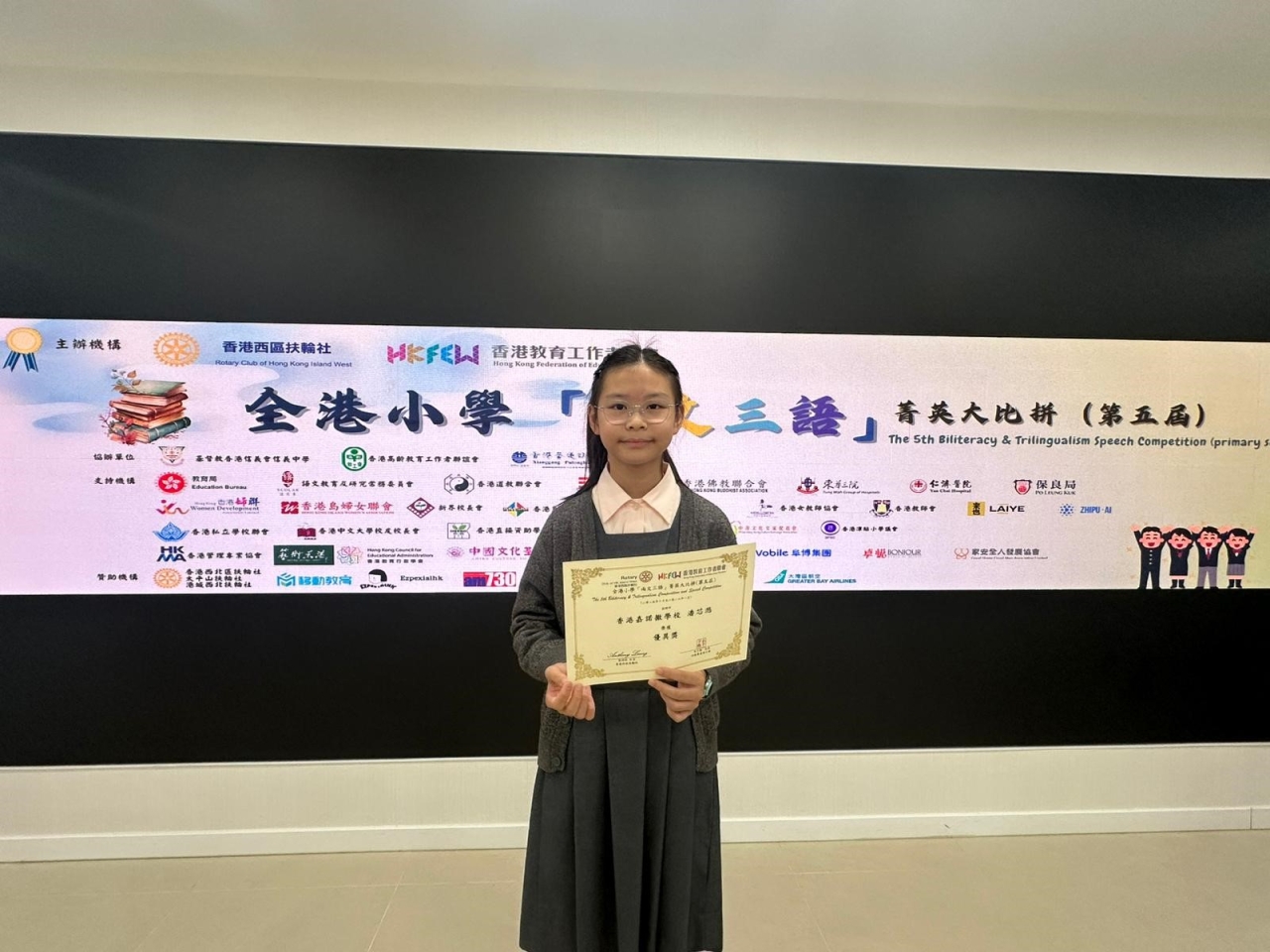 本年度共有9位同學參加了由香港教育工作者聯會及香港西區扶輪社舉辦的全港小學第五屆「兩文三語」菁英大比拼,在約三百名參賽者中,其中有5位同學成功進入複賽,而5A潘芯滺同學經歷了初賽、複賽及決賽的激烈競爭,最終榮獲優異獎。恭喜潘芯滺同學!