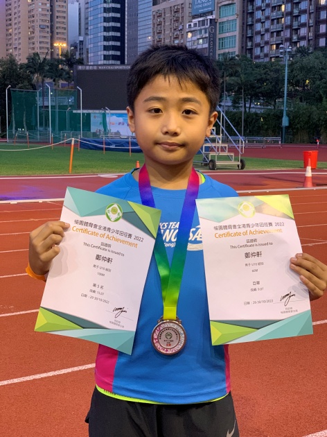 4E班鄭仲軒同學參加了2022年9月24日、25日及10月1日、2日「屈臣氏田徑會周年大賽 2022」,在60米短跑中奪得第三名(時間為9.25秒)及100米短跑中奪得第九名(時間為15.45秒)。