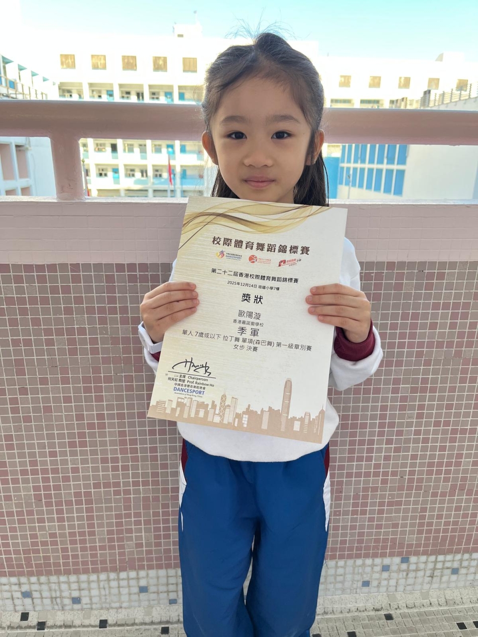 恭喜本校1F班歐陽旋於第二十二屆香港校際體育舞蹈錦標賽中表現出色,獲得以下獎項: